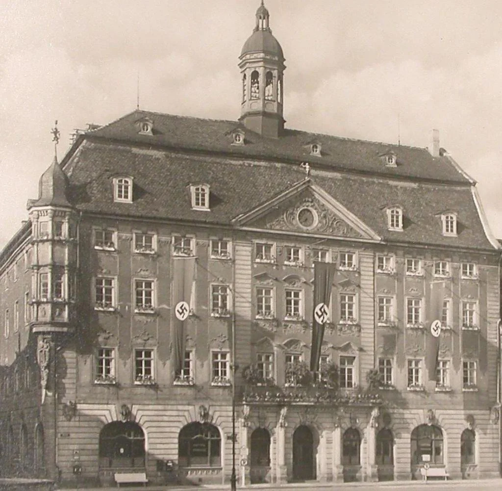 The rathaus (Town hall / City council office) in Coburg was the first official building in Germany to fly the Nazi flag on 18 January 1931. It was here in this marketplace that Hitler spoke before 10,000 people, including 1,300 holders of the Golden Party Badge during which he declared "With Coburg I made politics:"