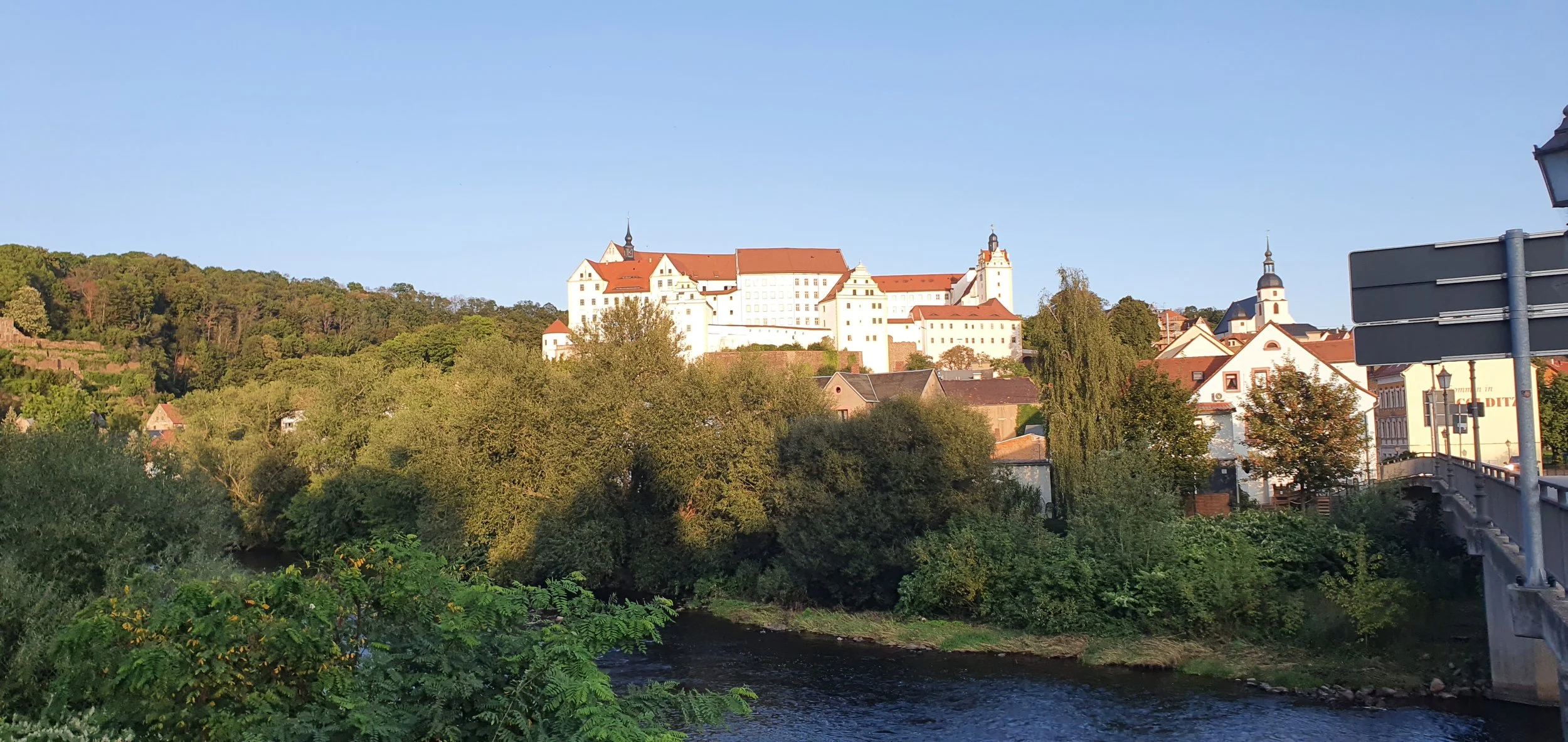 Entering the town - Colditz is situated in the Leipzig Bay, southeast of the city of Leipzig. The town centre is located on the banks of Zwickau Mulde river, south of its confluence with the Freiberg Mulde. The municipality had a population of 8,374 in 2020.